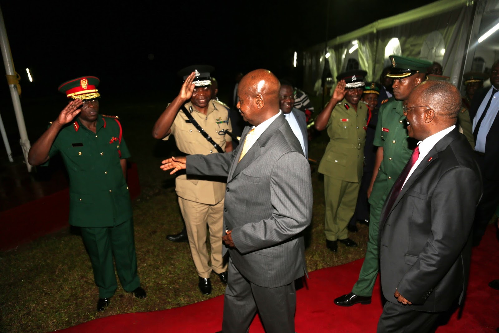 Rais wa Jamhuri ya Muungano wa Tanzania Dokta John Pombe Magufuli na mgeni wake Rais Yoweri Kaguta Museveni wakiagwa kwa saluti na Wakuu wa vyombo vya ulinzi na usalama baada ya kumalizika kwa dhifa ya kitaifa aliyomwandalia Ikulu ndogo jijini Tanga.
